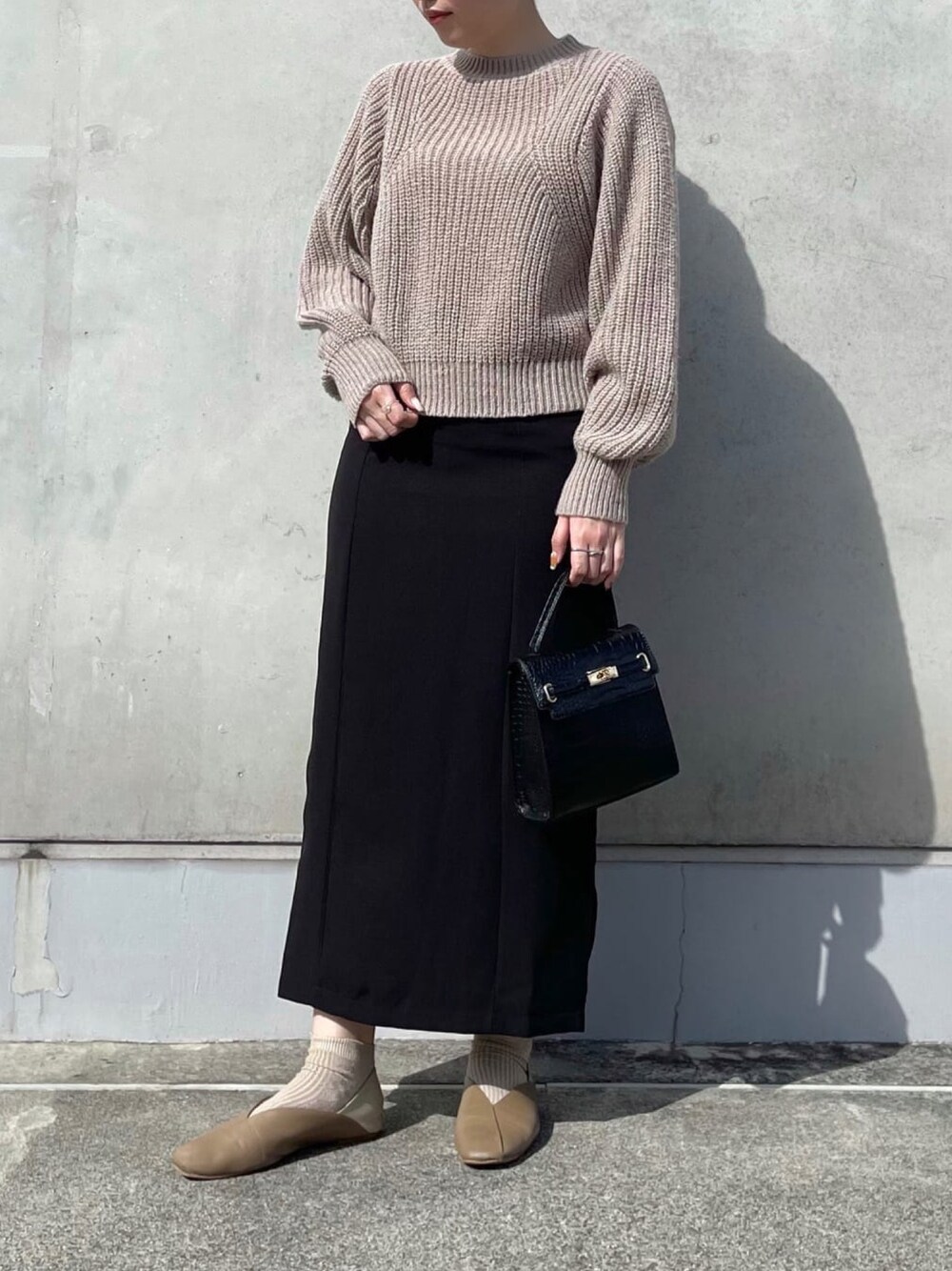 ニットはシンプルな形なので、着回し力◎です!ボリューム袖がかわいく、ちょうどいい丈感なのでハイウエストのボトムスとも合わせやすいですよ!スカートはタイトで綺麗なシルエットとストレッチ素材で伸びるので歩きやすいです!黒×ベージュで大人カジュアルコーデに♡