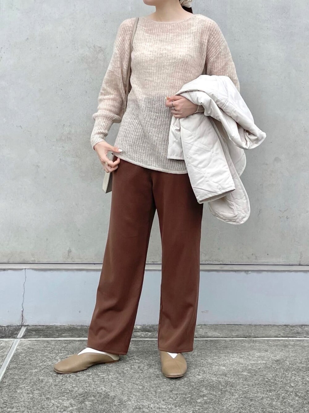 メランジニットは透け感があり、インナーの色を変えてもかわいいです♡今回は同系色で合わせて、ナチュラルな雰囲気に◎セットアップのパンツは他のアイテムとも着回しができて、柔らかい素材で履きやすいですよ! キルティングブルゾンは分厚めのニットなど着ても着膨れしないくらいゆとりがあり、羽織ってみたらとても軽いです!涼しくなってきたらすぐに着やすいアウターです☺︎