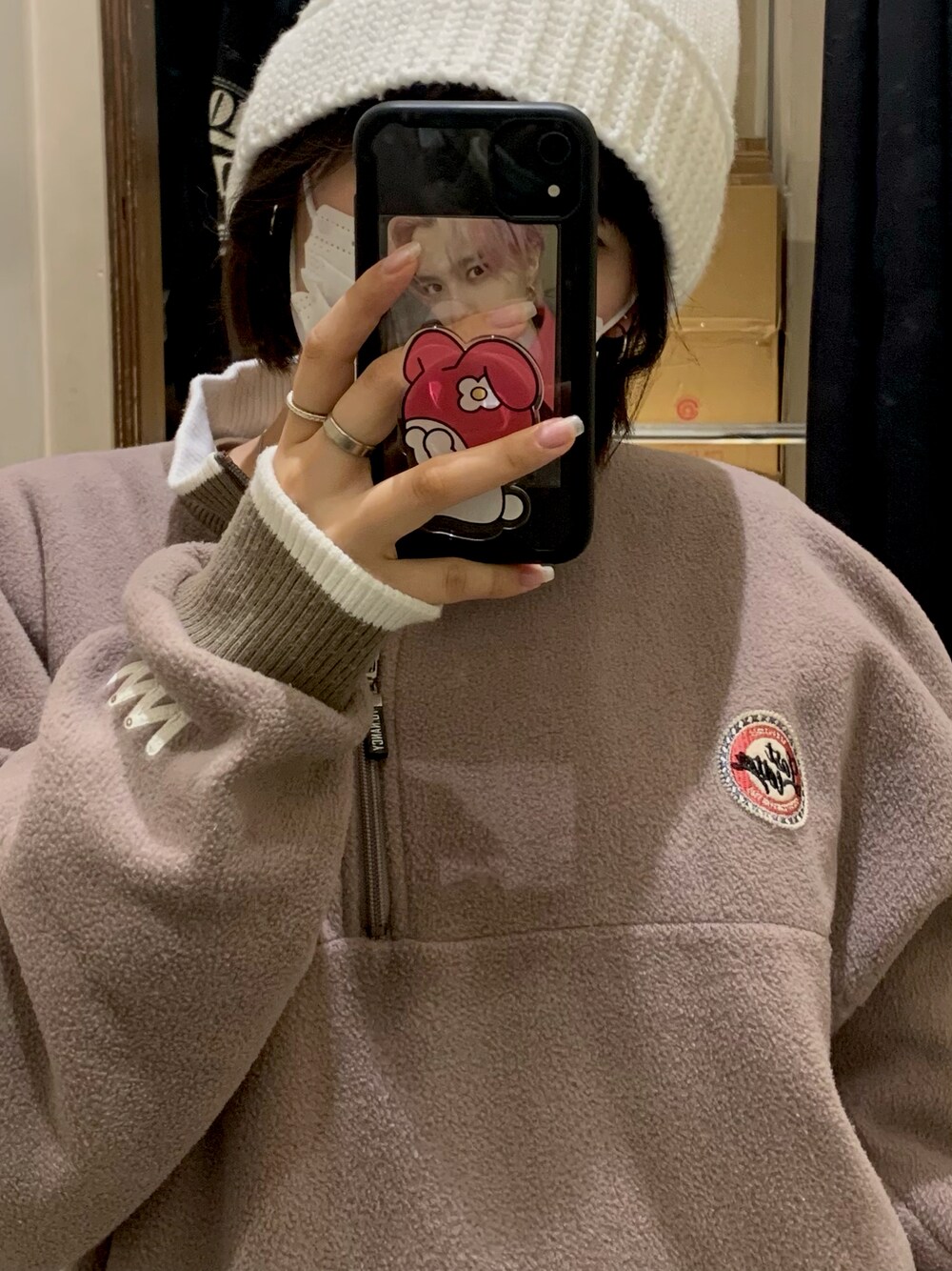 髪切って恥ずかしいからニットハットちゃん👩🏻🦲 このフリースたくさん褒められるから嬉しい^^