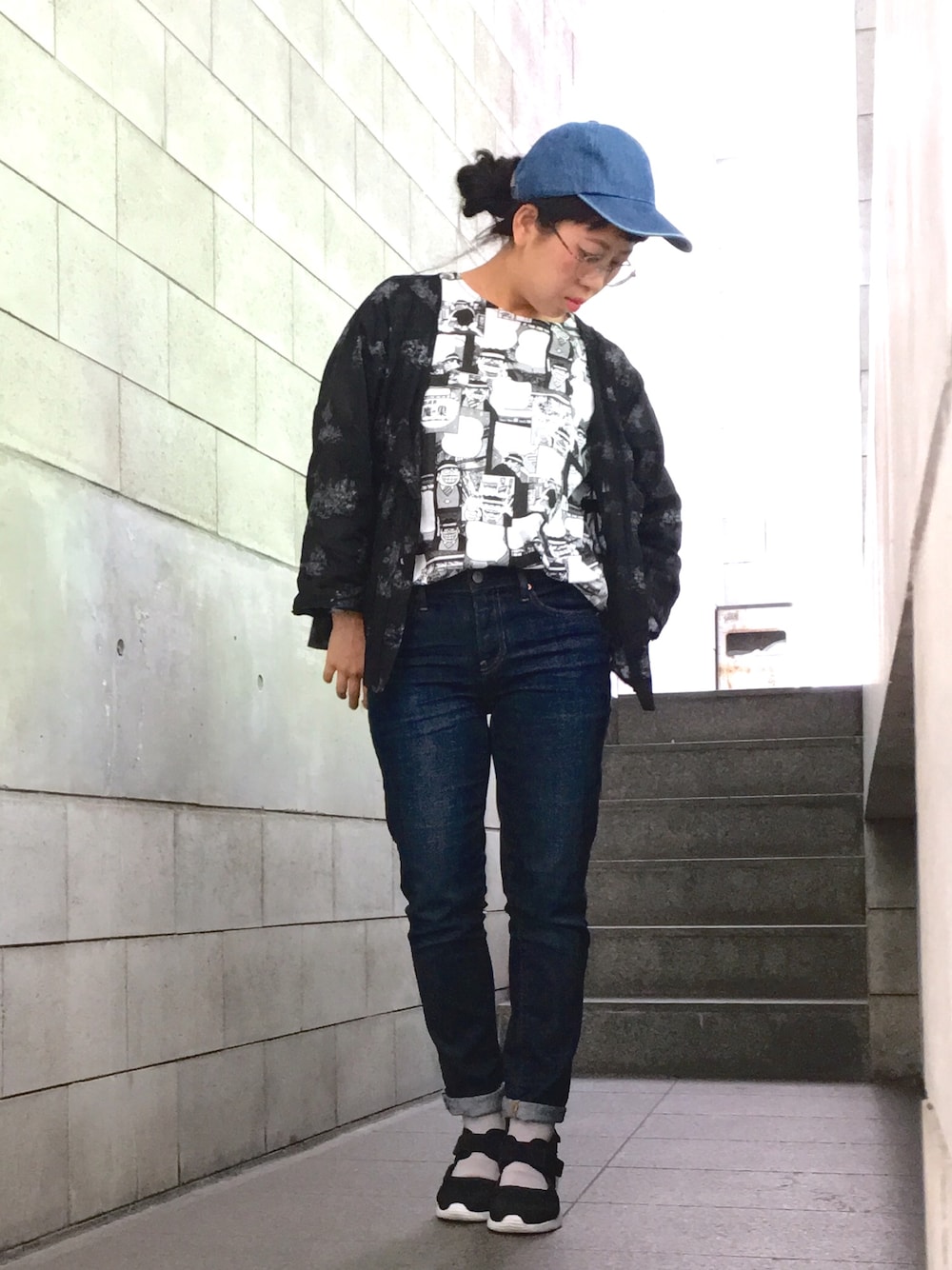 コミックTをキレイめカジュアルにコーデ🎶 よく見ると「笑ゥせーるすまん」のコミック柄😳 インパクト大なデザインですが、 ノンウォッシュデニム×ショートガウンで ガチャガチャ感をトーンダウンさせて 大人だからこそなお遊びコーデを👌
