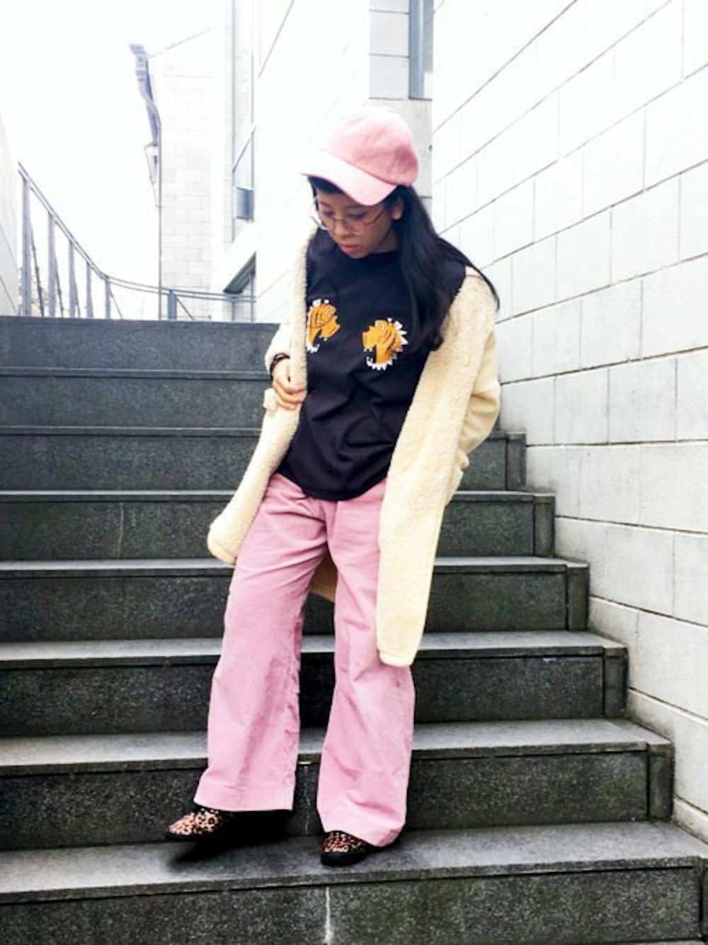 スカジャン風プリントT!!! スカジャン風なトラが可愛すぎるTシャツに一目惚れ😍 ハードっぽいのによくみると手書き感がゆるくてたまりません❤️ ハードなテイストだからこそ、 ピンクとボアコートでガーリィに! ベロアパンツも捨てがたかったけど、 太畝コーデュロイのワイドパンツとキャップ、 セットアップぽくあわせるのが◎ アウターはスカジャンイメージとは真逆の 白ボアの超女子アイテムで。