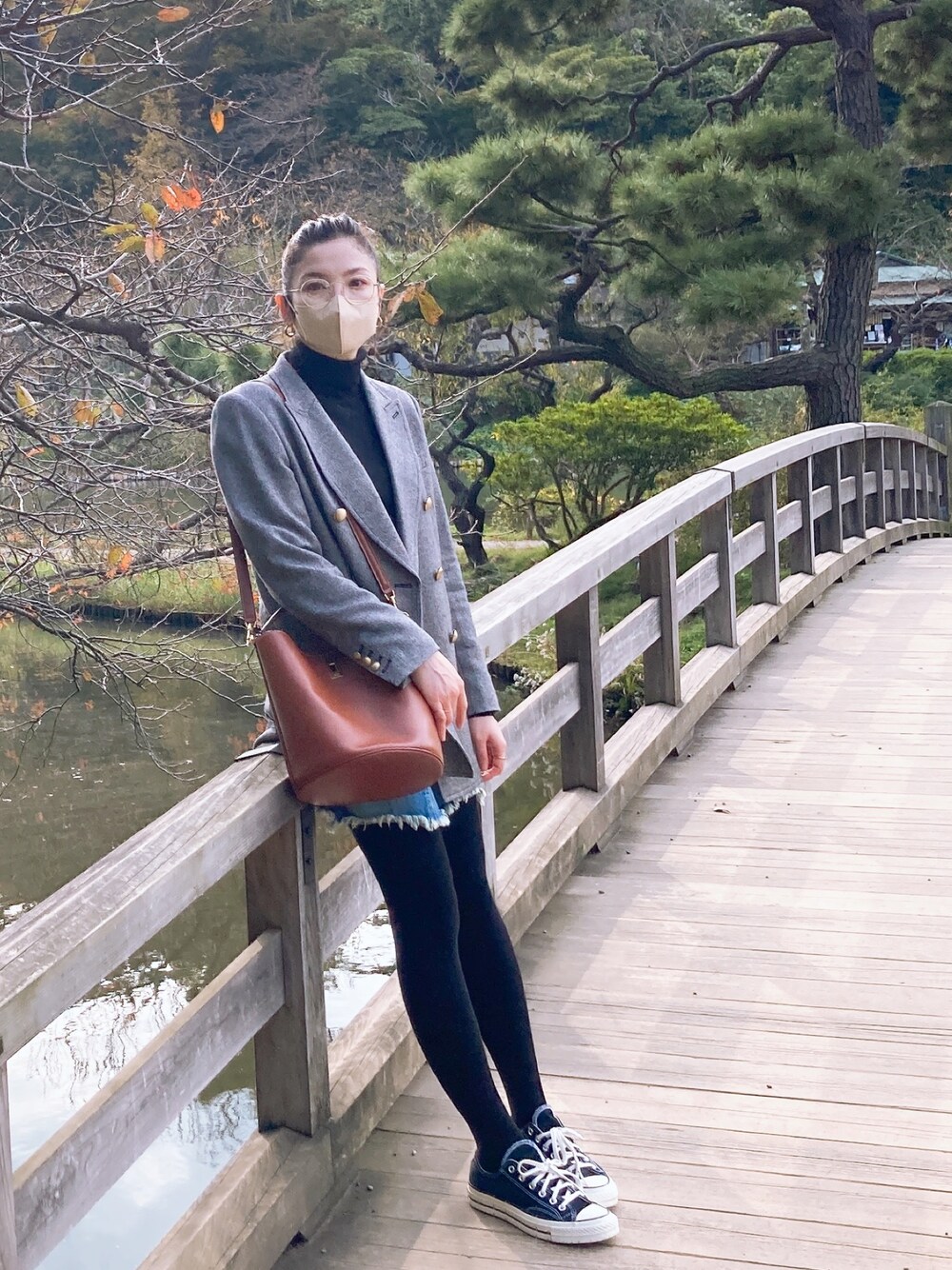 紅葉が綺麗なシーズンです🍁 骨スト族なので肩ガンダムに見えないジャケットを探すのに苦労します。 天然の肩パット入りです。 こちらのメガネは39マートで買いました。アンティーク風でお気に入りです。