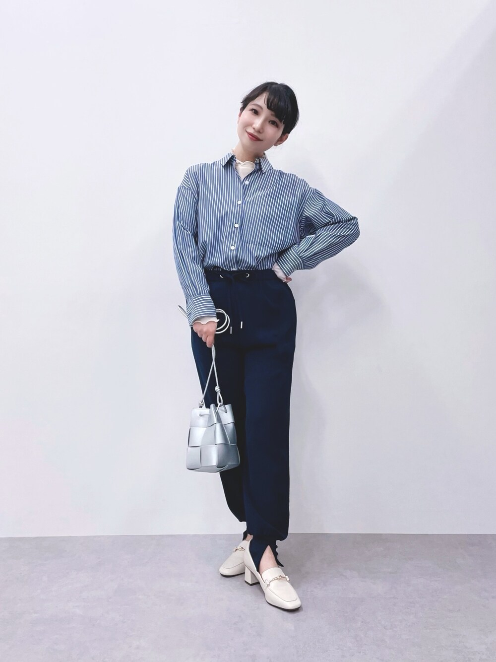 ストライプシャツに シアーメローのトップスをちら見え させカジュアルに♩ パンツはウエストゴムで楽ちんで 裾スリットは足長効果も◎ ┈┈┈┈┈┈┈┈┈┈ 身長:146㎝ 骨格:ストレート PS:ブルベ夏 着用:M ┈┈┈┈┈┈┈┈┈┈