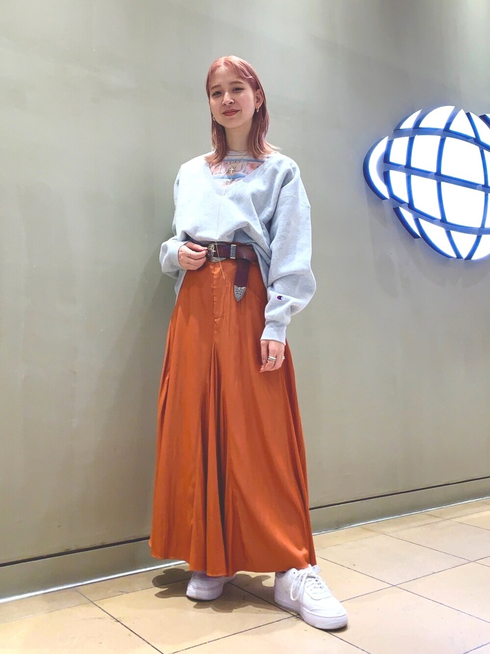 髪の毛がピンクなので 暖色多めのスタイリング。 championの別注スウェットは 深めのVネックなので中のTシャツをチラ見せ!