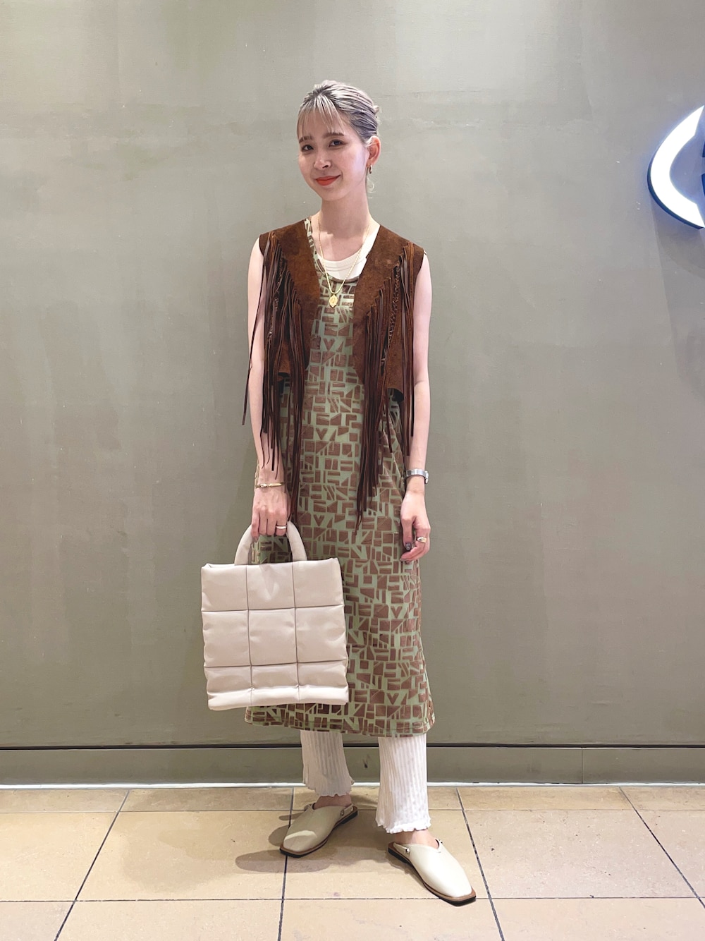 ワンピースにレザーベストを合わせで着回しコーデ! ワンピースのカラーが派手なので小物は白で統一しました☺︎ もう気分は秋〜ですがまだまだ暑いので ノースリーブアイテムは重宝します、、、。