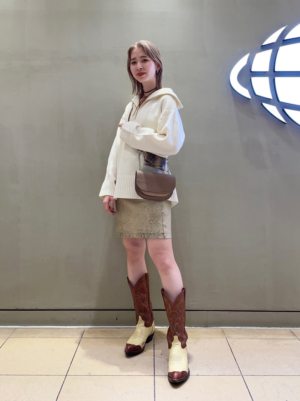 今年はもっぱらボトムはミニ丈が気になりますね〜 大きな襟がかわいいボリュームニットに私物のパイソンミニスカートを合わせました! ウエスタンブーツを合わせて私らしく。。。 そしてそして持っているバッグは小さい方を付ける チェーン位置を変えればレパートリー沢山! 写真をご参照ください〜☺︎