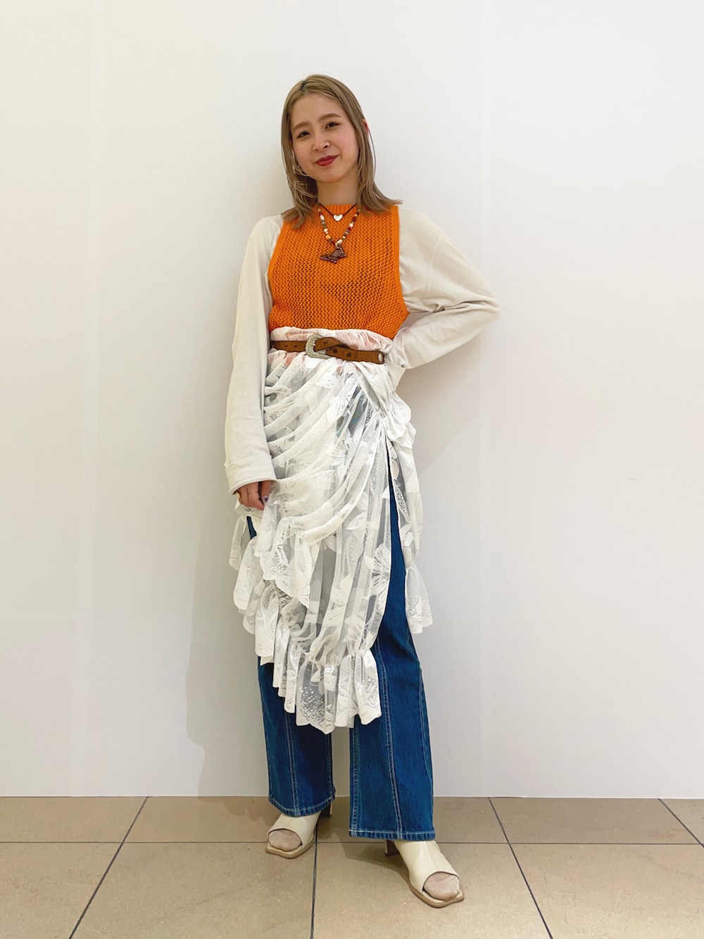 鮮やかなオレンジが可愛いメッシュタンクが入荷しました〜!! トレンドのアメスリ!首詰まりで肩幅狭め!カワイイ! お気に入りのyuhan wangのスカートと合わせで春らしいスタイリングに〜♡