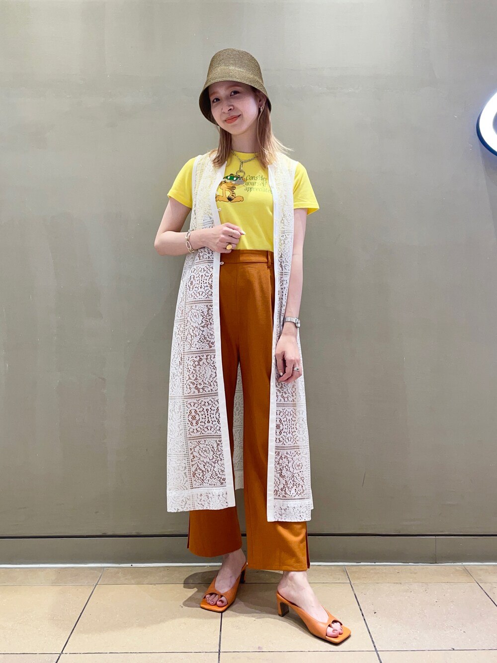 yellow×orangeの夏カラーコーデです☺︎ ガーフィールドのTシャツは新入荷商品! ミニマムなシルエットがカワイイTシャツです♡ 子供っぽくなり過ぎないよう、レースジレをプラスしました〜!