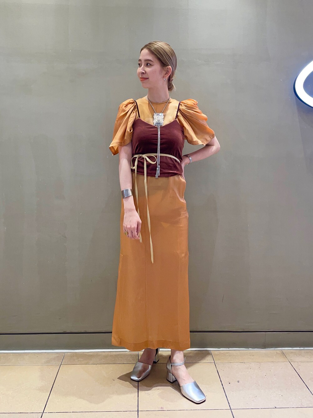 はやくも22AWアイテムが入荷してますよ〜! TOGApullaのワンピースはボリュームのある袖がポイント! その上からベロアビスチェを重ねました〜! 秋らしいこっくりカラー、、、はやく秋にならないかなぁあ〜