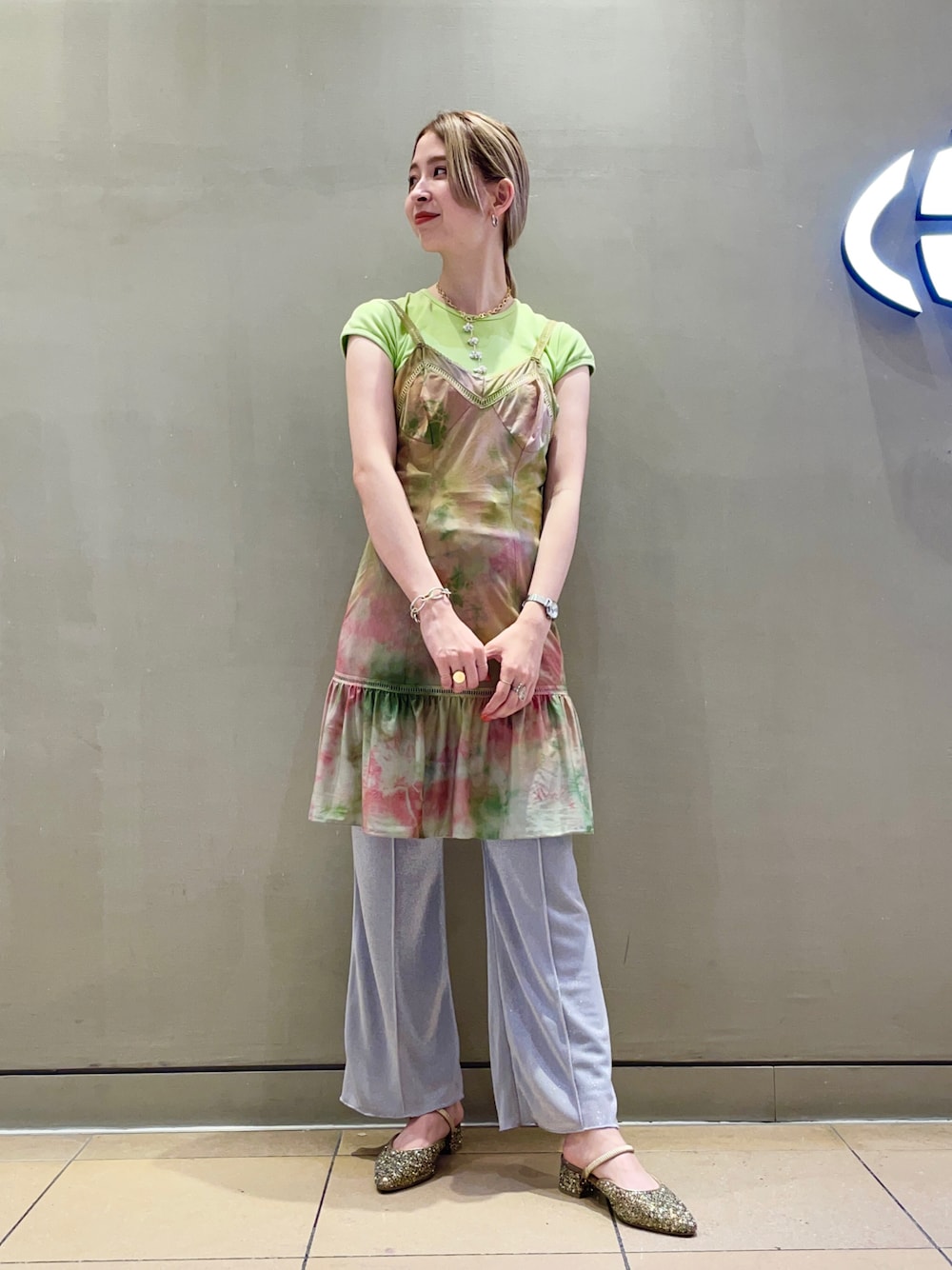 夏らしいカラーのヴィンテージワンピースに ラメパンツ、グリッターシューズを合わせて とことんギラギラに、、♡ 色味は足さずに異素材MIXができる グリッターアイテム、おススメです♪