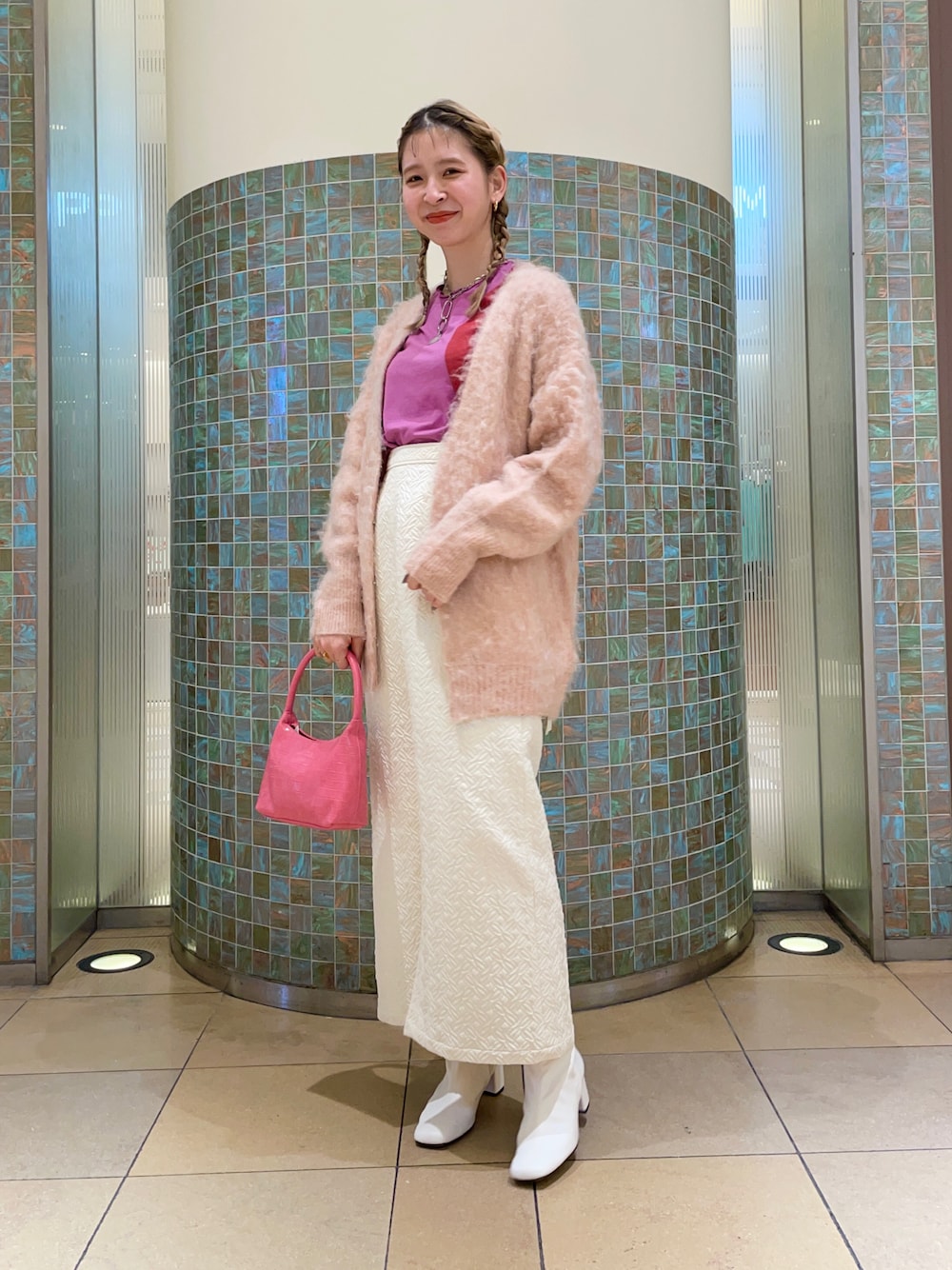ピンクとホワイトを集めましたなスタイリングです〜! こんな感じでトーンの違う同系色カラーを合わせると 上級者オシャレ感が増すのでオススメです。 シャギーカーディガンは春まで使えるのでセールの今がお買い得です〜♪