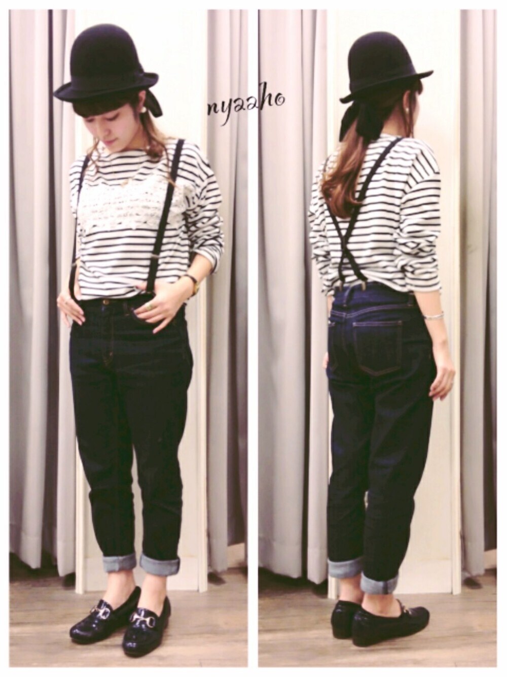 おにゅーの ボーダー×レースTOPS*\(^o^)/* ボーダーとデニムだけだとカジュアルすぎるから、 サスペ、ハット、リボン、ローファーでドレスアップさせました( ⁼̴̶̤̀ω⁼̴̶̤́ ) 秋冬にツバ広ハットかぶりすぎて飽きちゃって、 今はボーラーにハマりちゅう( ⁼̴̶̤̀ω⁼̴̶̤́ )
