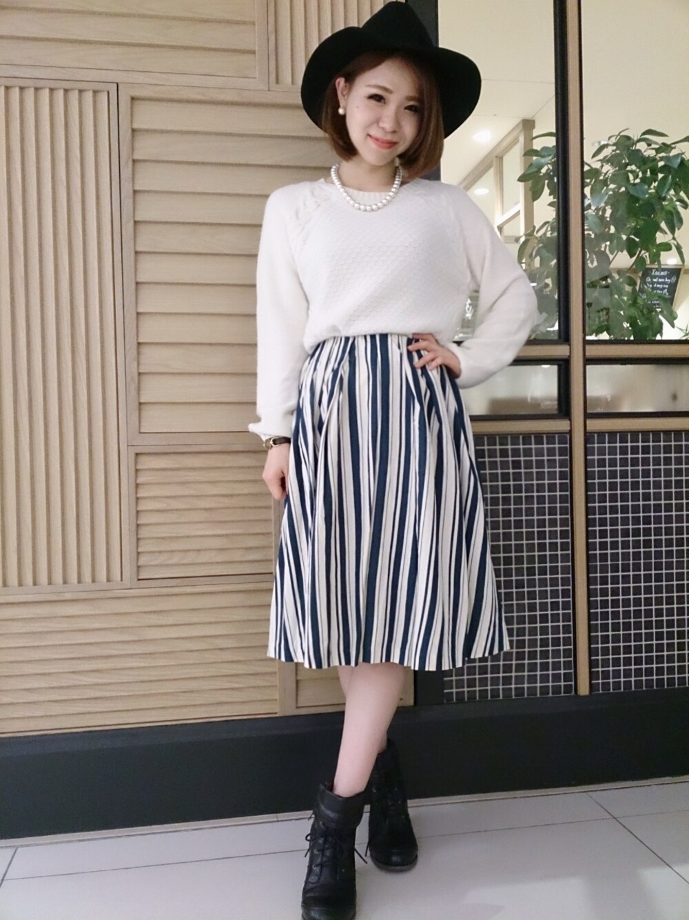 ランダムなストライプのスカートをメインに、ゆったりニットでリラックススタイルに。 小物はブラックで統一して、ゆるくなりすぎないように引き締めました♪