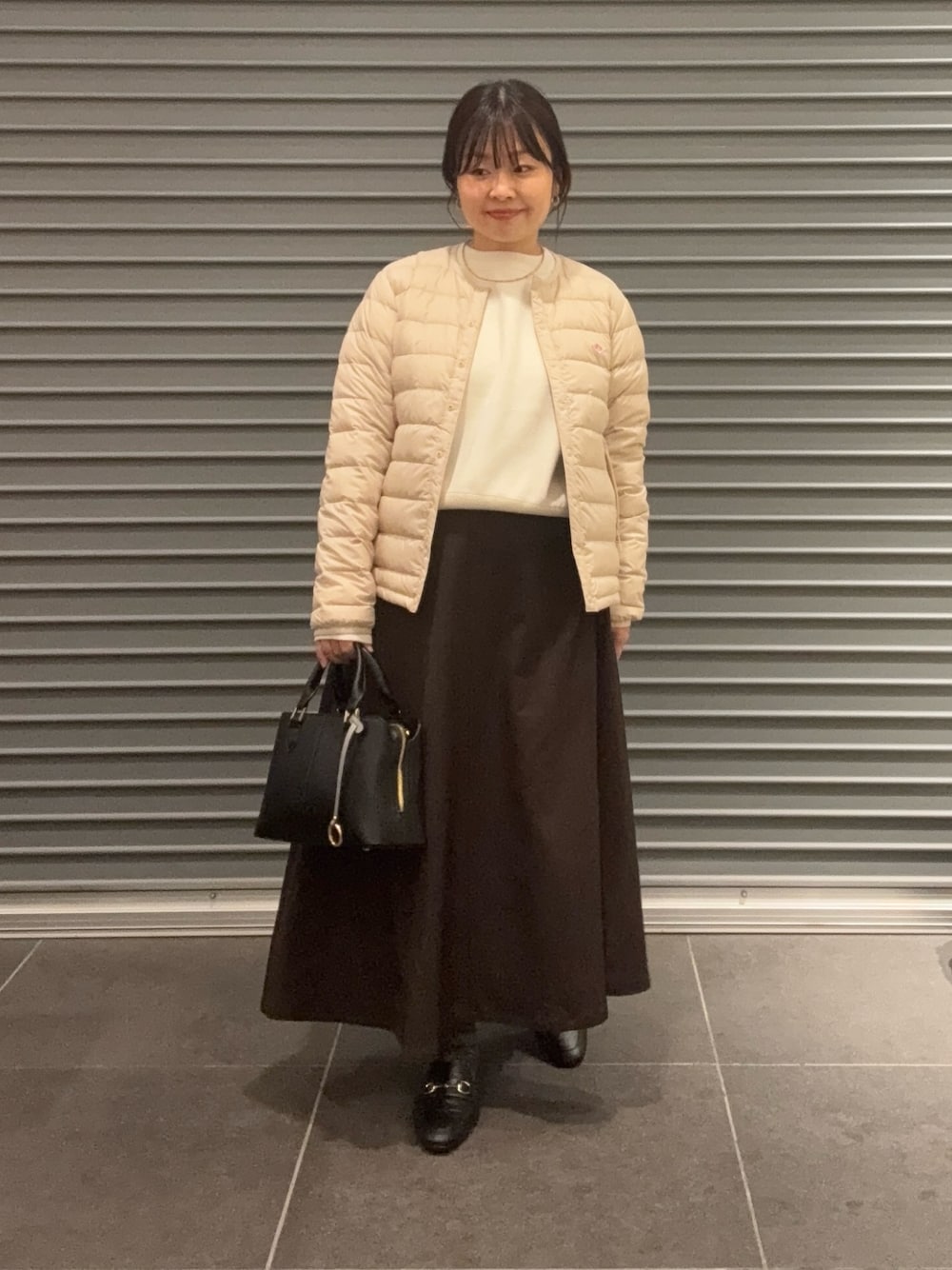 DANTONインナーダウン とても軽く秋から着れるインナーダウンです。着丈もコンパクトなので小柄な方にも。 完声フレアスカートにローファーで秋冬キレイめコーデにしました。秋の通勤コーデにもおすすめです。インナーに着たニットはさらっとした素材でベーシックに着回せるので一枚持っておくと万能です。 是非参考にしてください。