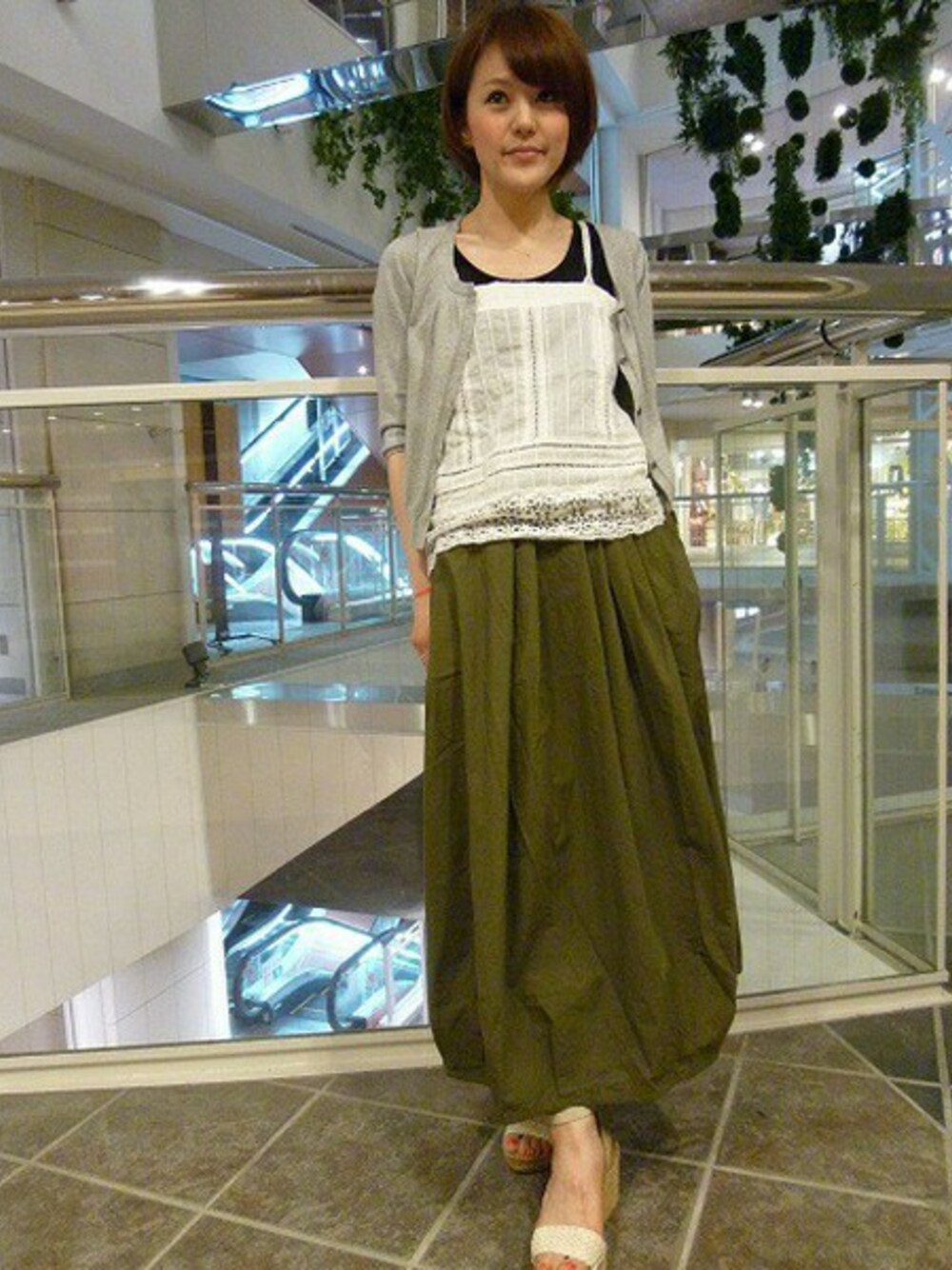 新作のバルーンシルエットのスカートに女の子らしいレースキャミ&ショート丈のカーディガンをあわせました☆