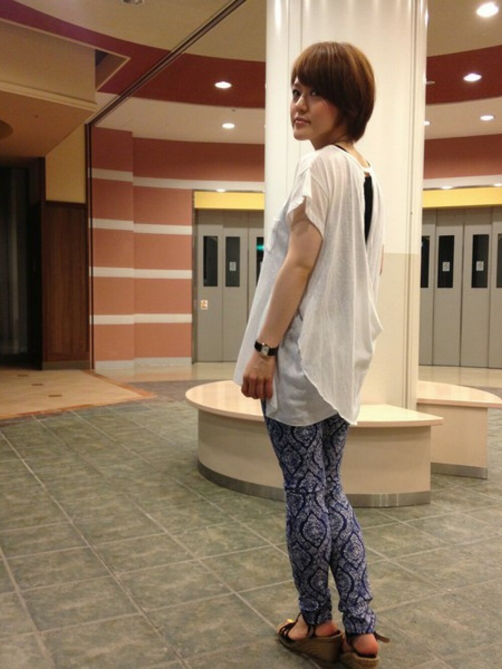 バックスタイルがおしゃれなカットソーは旬な柄レギパンと合わせて。
