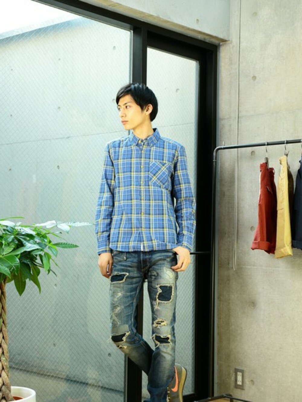 王道のアメカジスタイルをすっきりとした印象でコーディネートしました。全体的にブルー系でまとめています。