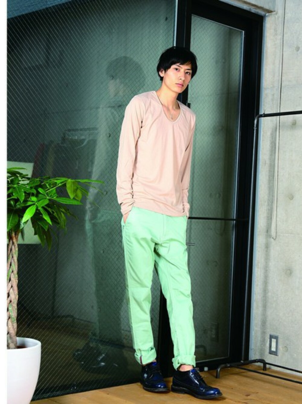 シンプルなコーディネートながら配色に変化を付ける事で今年っぽい着こなしに。パンツはきれいなテーパードシルエットなのでタイトなトップスはもちろん、大きめのサイズも合わせる事が出来ます。