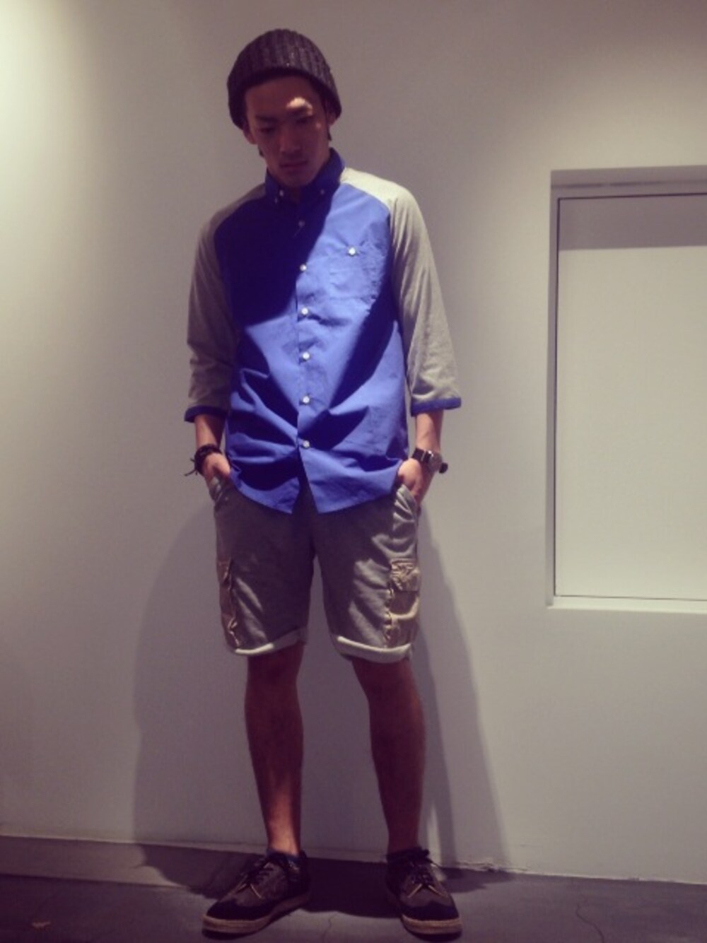シャリ感のあるタイプライター生地と柔らかい天竺の切り替え7分袖シャツ。 ラグランスリーブなので動き易く、着心地も良いです! ショーツもスウェット地でセットアップ風に合わせてます。