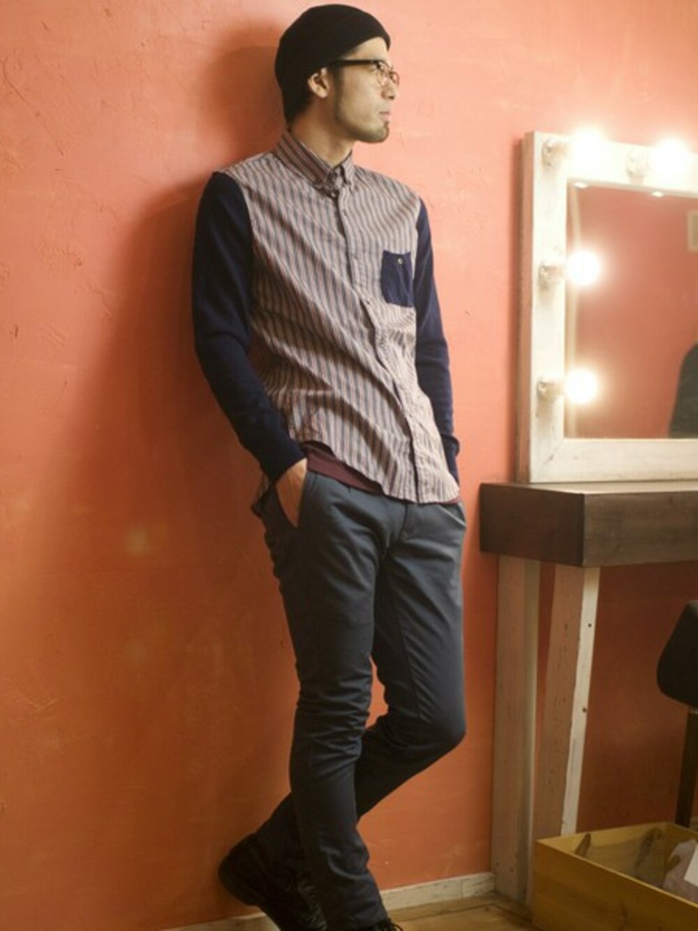 シャツのインナーにあえて配色のカットソーを取り入れてました。落ち着いた色なのでなんにでも合います。