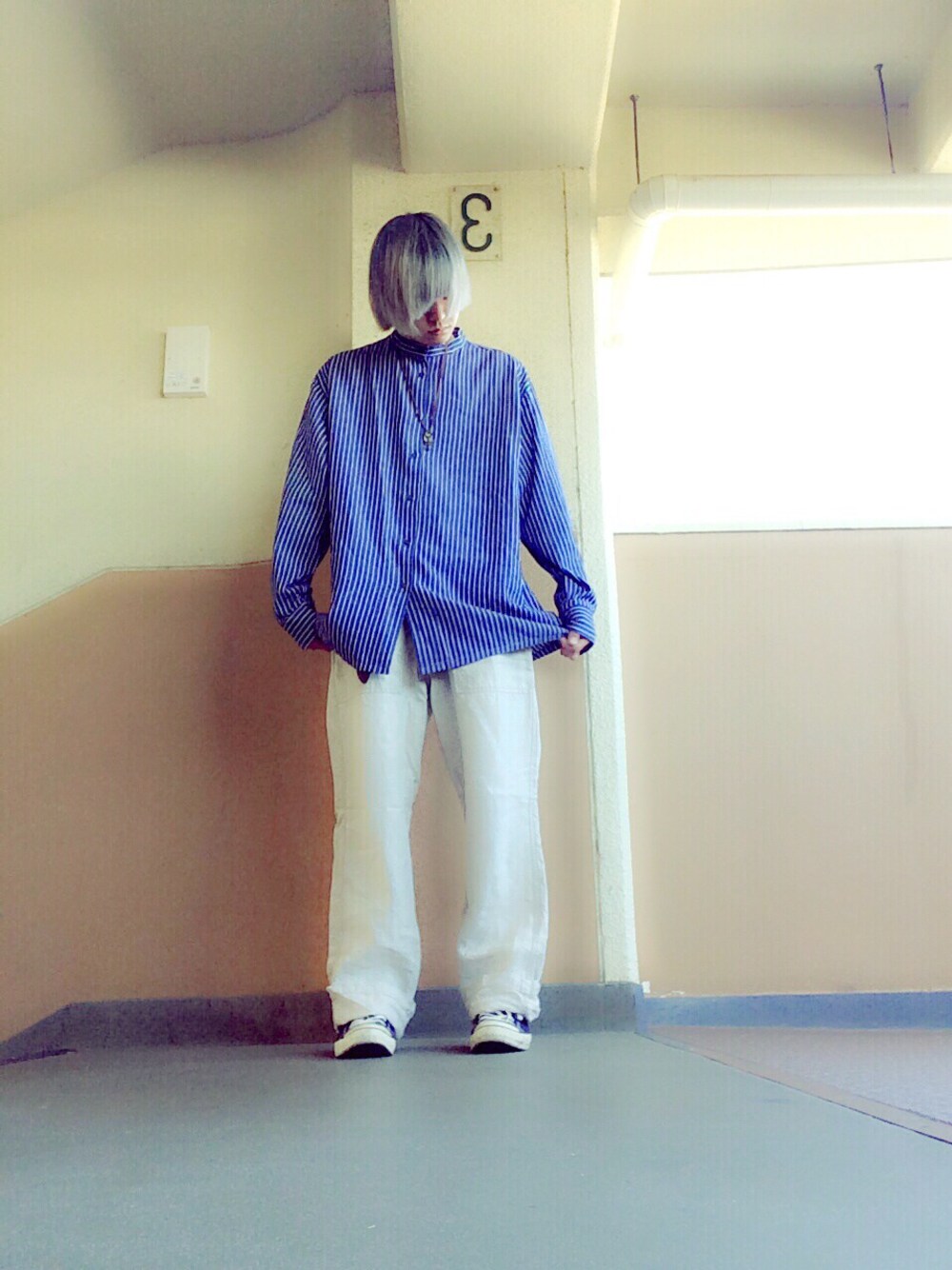 ゆるゆるコーデです。 昨日のシャツと似てますがまた違うオーバーサイズのストライプシャツに麻っぽいやつ??のゆるパンツを合わせました!! 上手く撮れなくていろいろ考えてあたふたしてる時に撮れた写真ですwww ぴんともぼけててすみませぬ、、