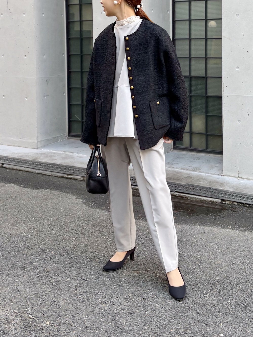 卒業式や入学式のシーズンが近づいてきましたね! 上品なツイードは羽織るだけできちんと感が出ます◎ インに着たセットアップは1セット持っていれば、セレモニーはもちろんオフィスなどにも着回しできて、あれば絶対便利! 低身長でもバランス良く着られました。