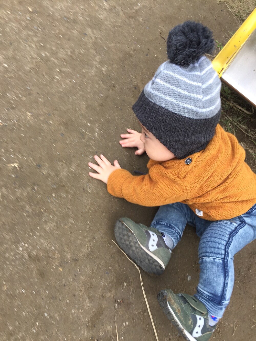 ♡、save+、コメントありがとうございます😊!とってもうれしいです✨ すっかり冬服…まだ歩けないのだけど、サイズアウトしてしまいそうなので、ファーストシューズ履いて公園へ✨ 結局ハイハイで土だらけ😂