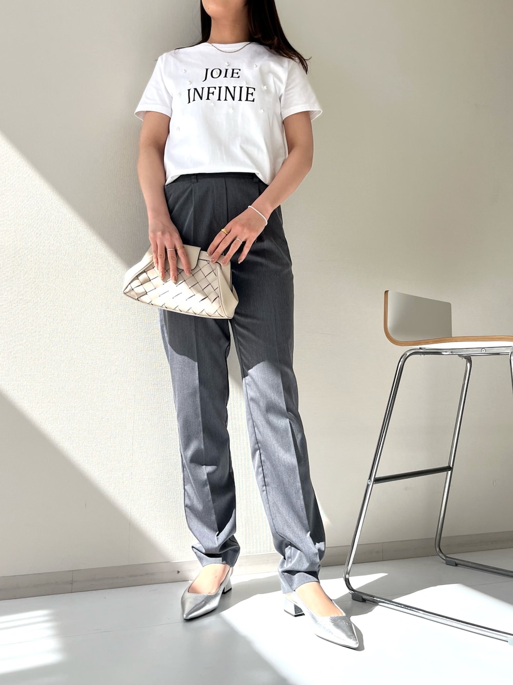 パールモチーフのTシャツは、カジュアルになりすぎず大人な印象に🫧 高身長設計のパンツは丈感がたっぷりで170cmでも余裕です◎ 170cm/イエベ/骨格ストレート