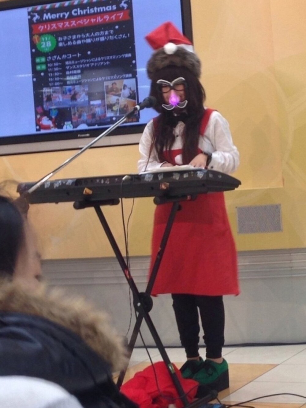 神戸北イオンのクリスマスライブのためにサンタ衣装で♪ 鼻メガネはチカチカ光ってステキ! セリアさん、ありがとう👓 めりーくりすます🎄🍷🍰