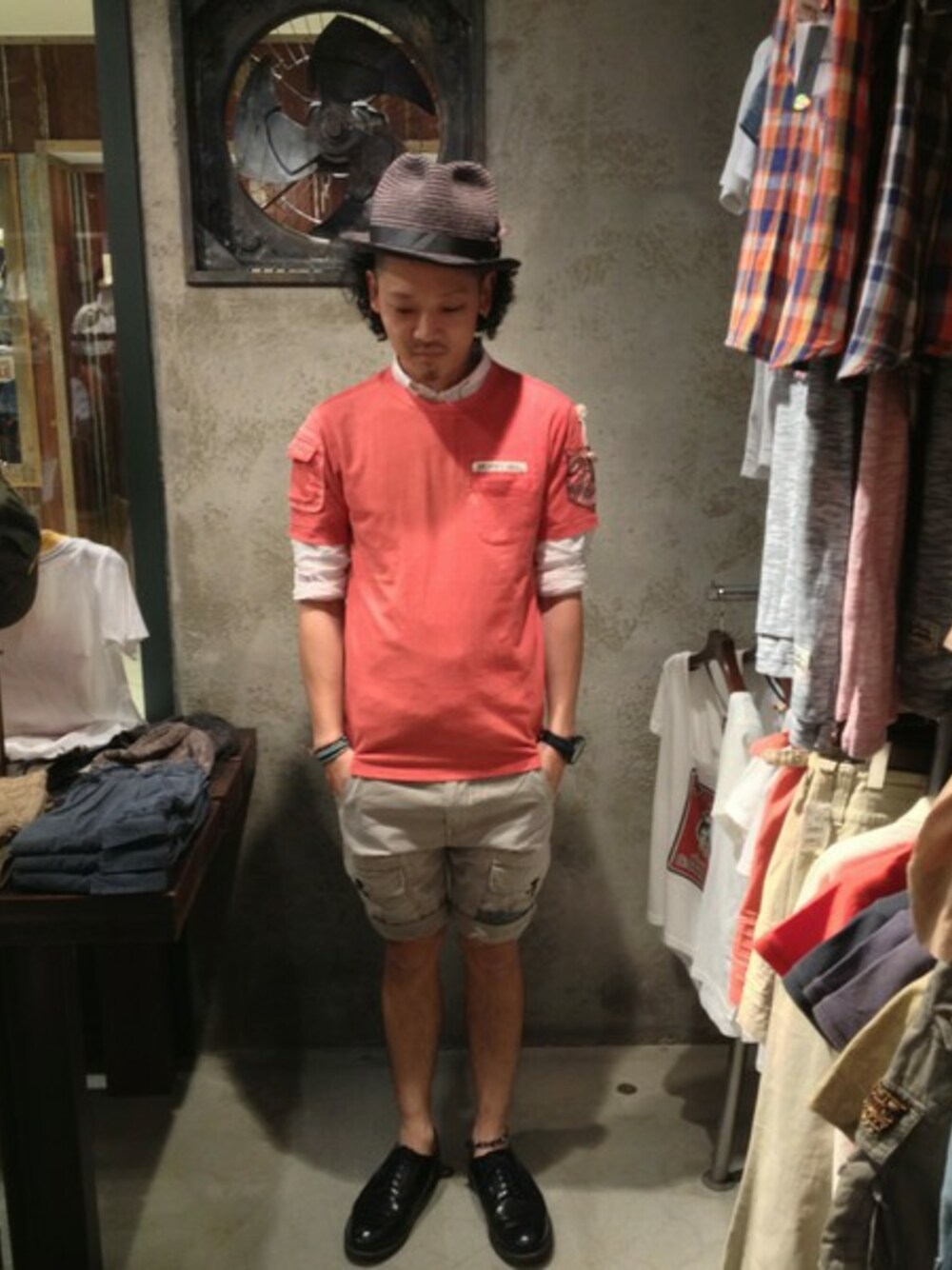 膝上のショーツに明るい色のTシャツを取り入れた夏スタイルです!!