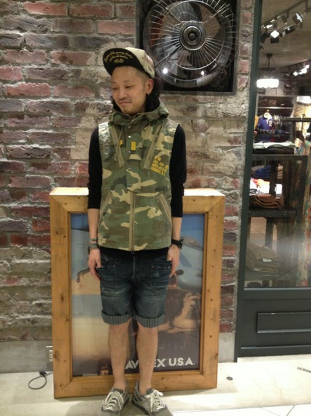 デニムショーツにカモフラージュのベストを取り入れたミリタリースタイルです!!