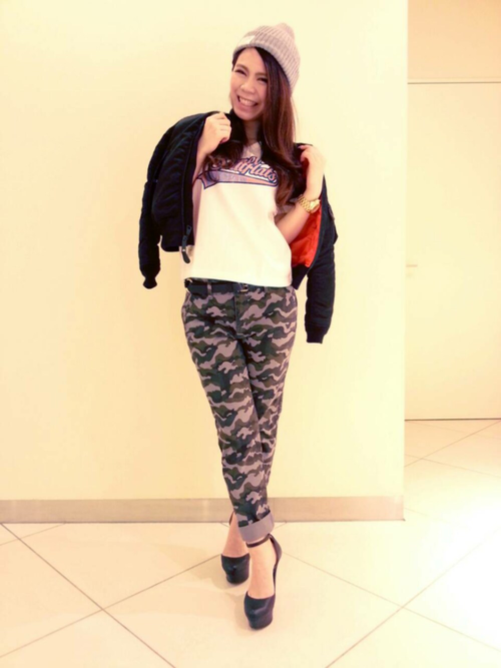 カモフラ×MA-1 code❤ カモフラにMA-1でボーイッシュになりそうなときは ハイヒールで女性らしさたしちゃいましょう( ^ω^ ) ロゴTもピンクで可愛いですよ\(^o^)/💕 AVIREXのTシャツは本当に着やすいので めっっっちゃオススメです🙌🙌🙌 MA-1もあったかいんだからぁ~♪