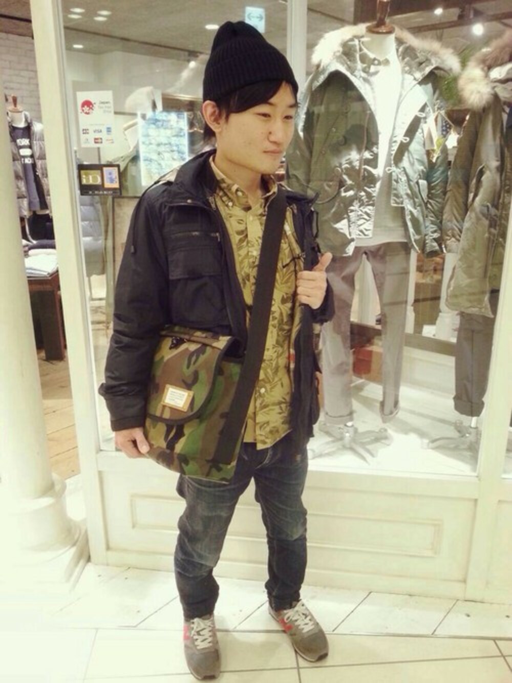 シンプルなアウトドアスタイルに迷彩とリーフ柄でアクセント!! 着用のアウター店頭で大幅にセール中です!!