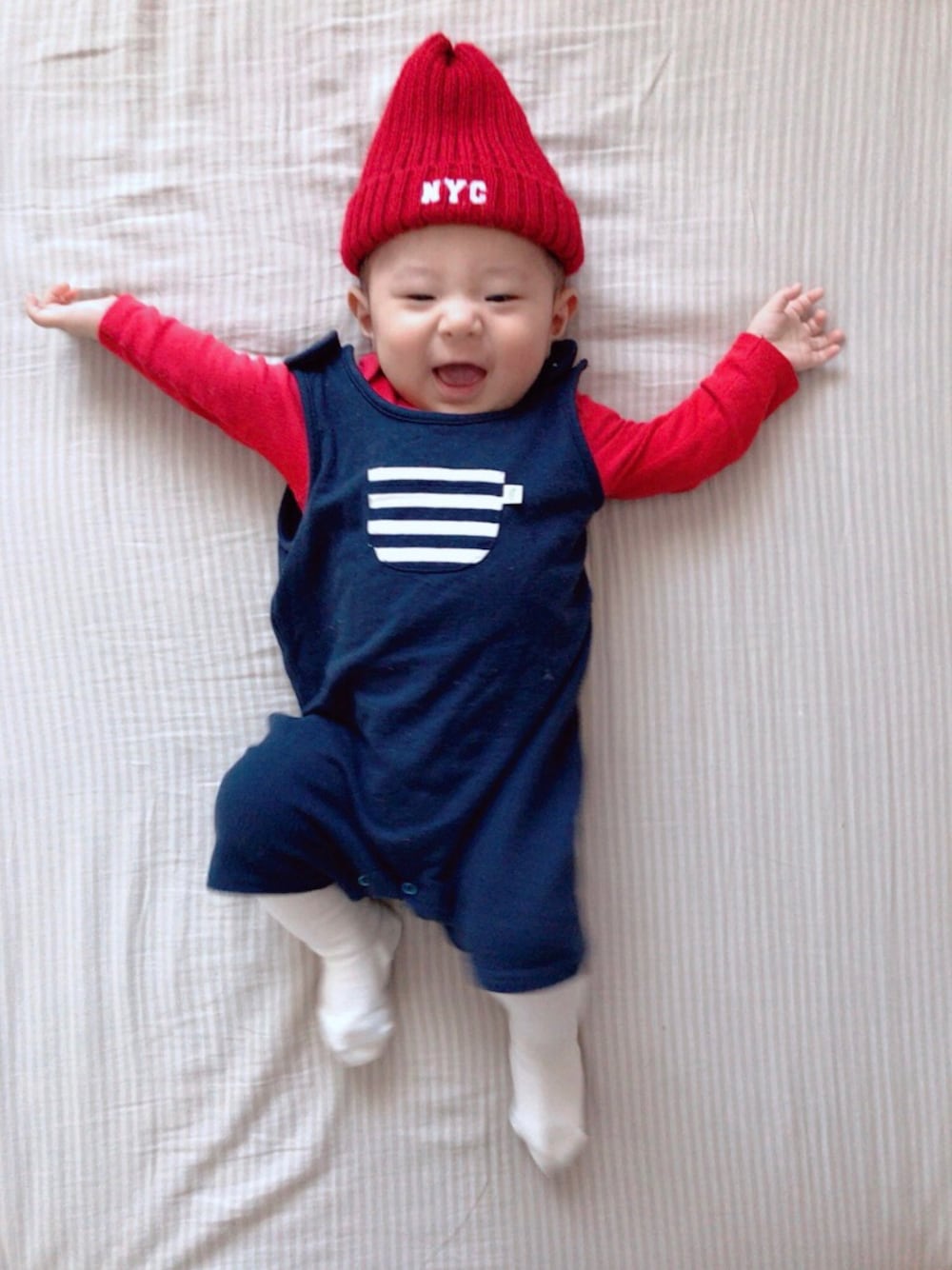 なんだか今日はマリオみたいな色合いになってしまった。 いや、 紅白でめでたいめでたい。 いつものニット帽、これ実は、ハゲ隠しなんです。 ...グリコ!! 生後155日目の秋。