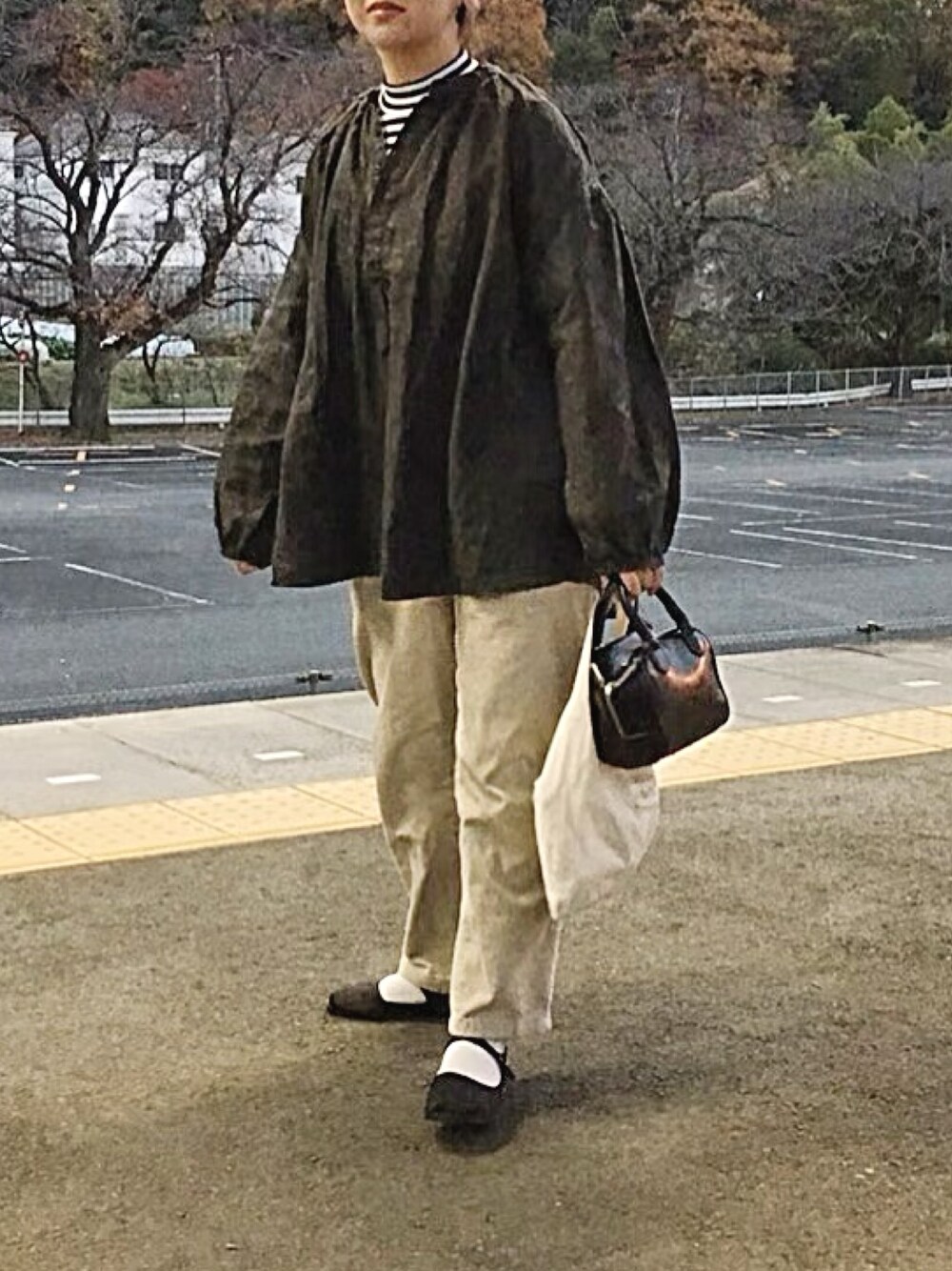 ブラック系のシャツ/ブラウスを着用したレディースの秋コーディネートの1枚目の写真
