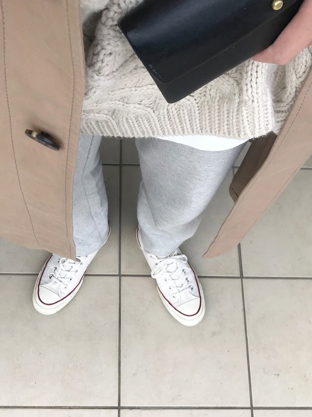 グレー系のスウェットパンツを着用したレディースの秋コーディネートの1枚目の写真