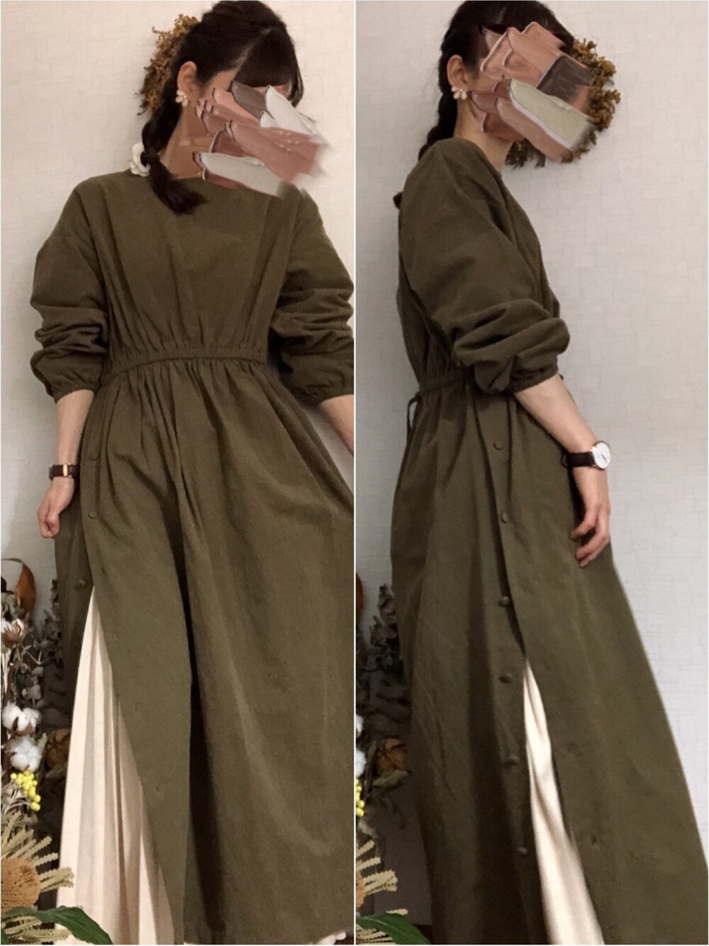 はるちゃんのコラボワンピースを 今日も着ました‼︎ この前はプリーツパンツを合わせたので スカート合わせにして、ボタンを4つ あけました! 髪型を変えて、雰囲気変えたつもりです‼︎