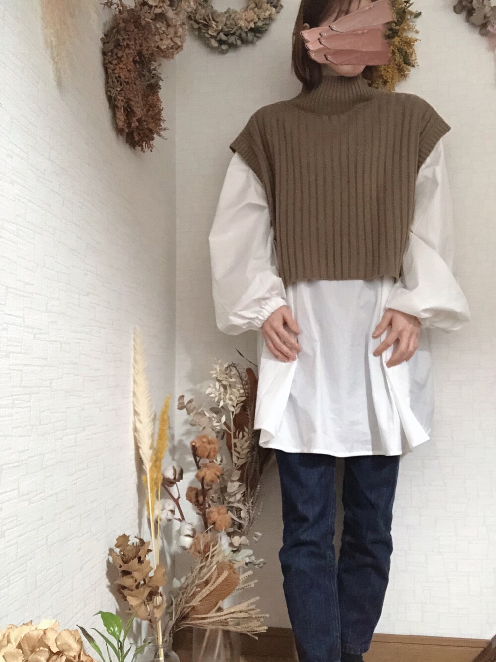 ちょっと寒かった日のコーデ。 ニットベストで丁度良かった。 カジュアル。 ブラウス×デニム。
