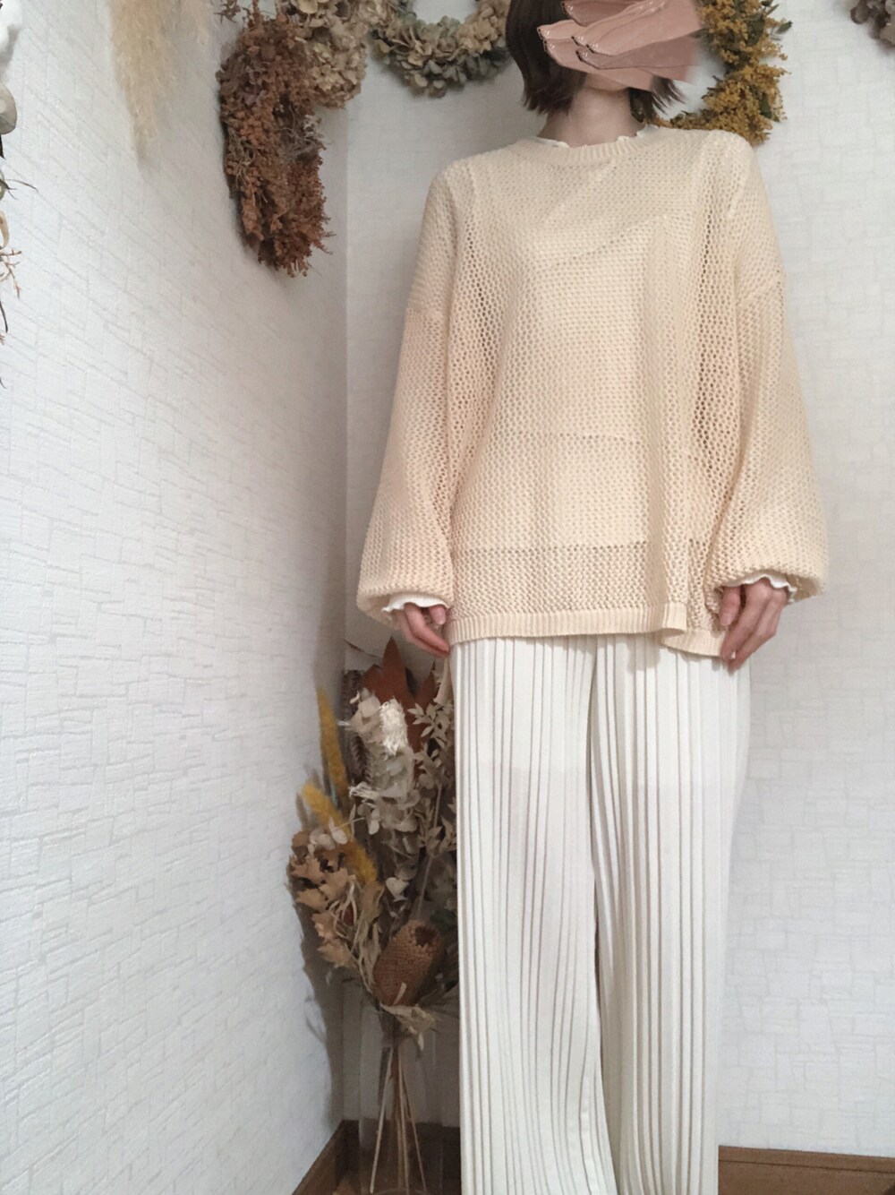 重ね着すると可愛いトップス。 【後藤真希セレクト】メッシュ編みサイドスリットプルオーバー white×beige。