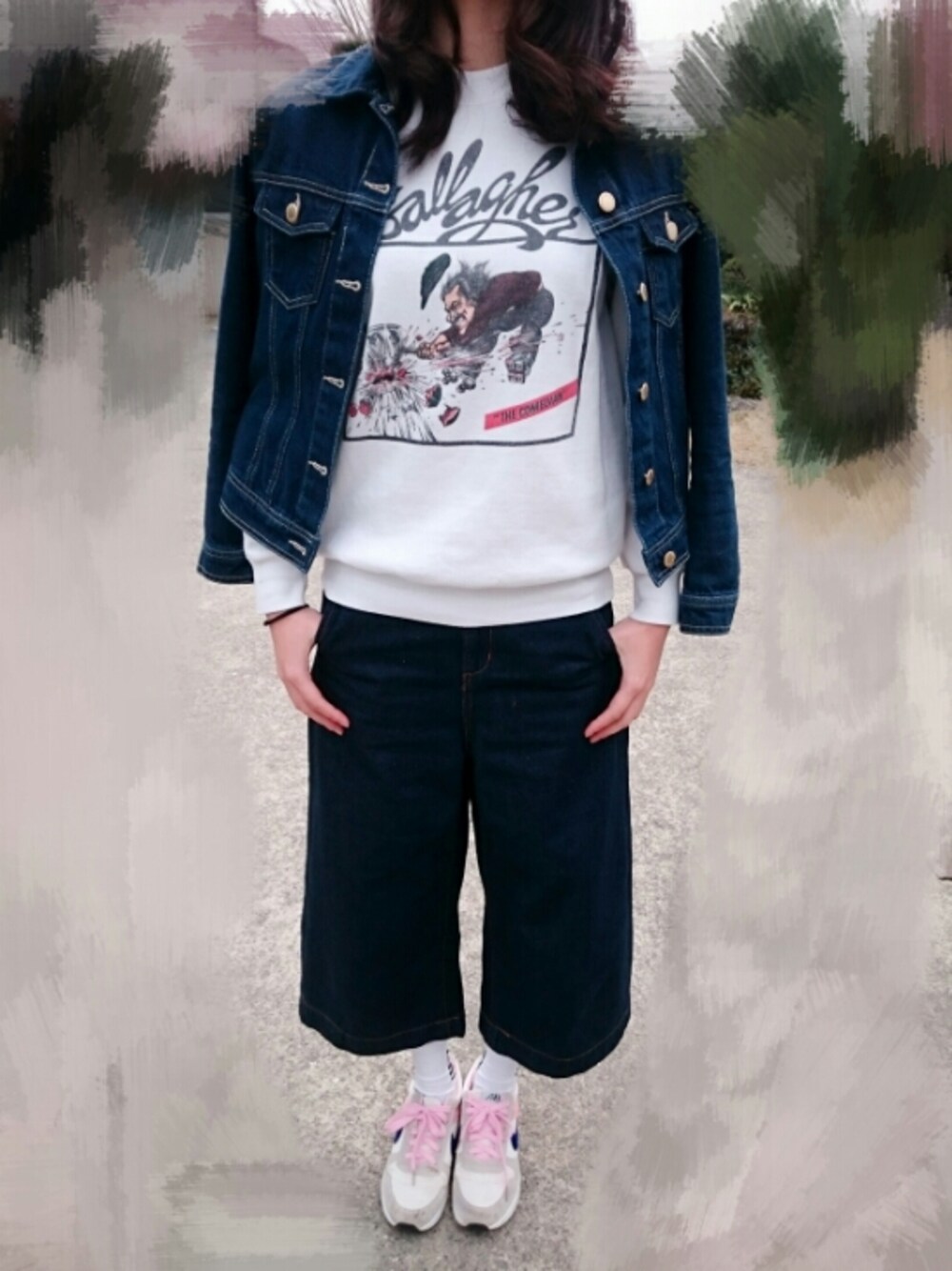 ichieで購入したお気に入りのスウェットにワイドパンツとデニムジャケット🙆 春になってちょうどよい気候ですね🌸🌸