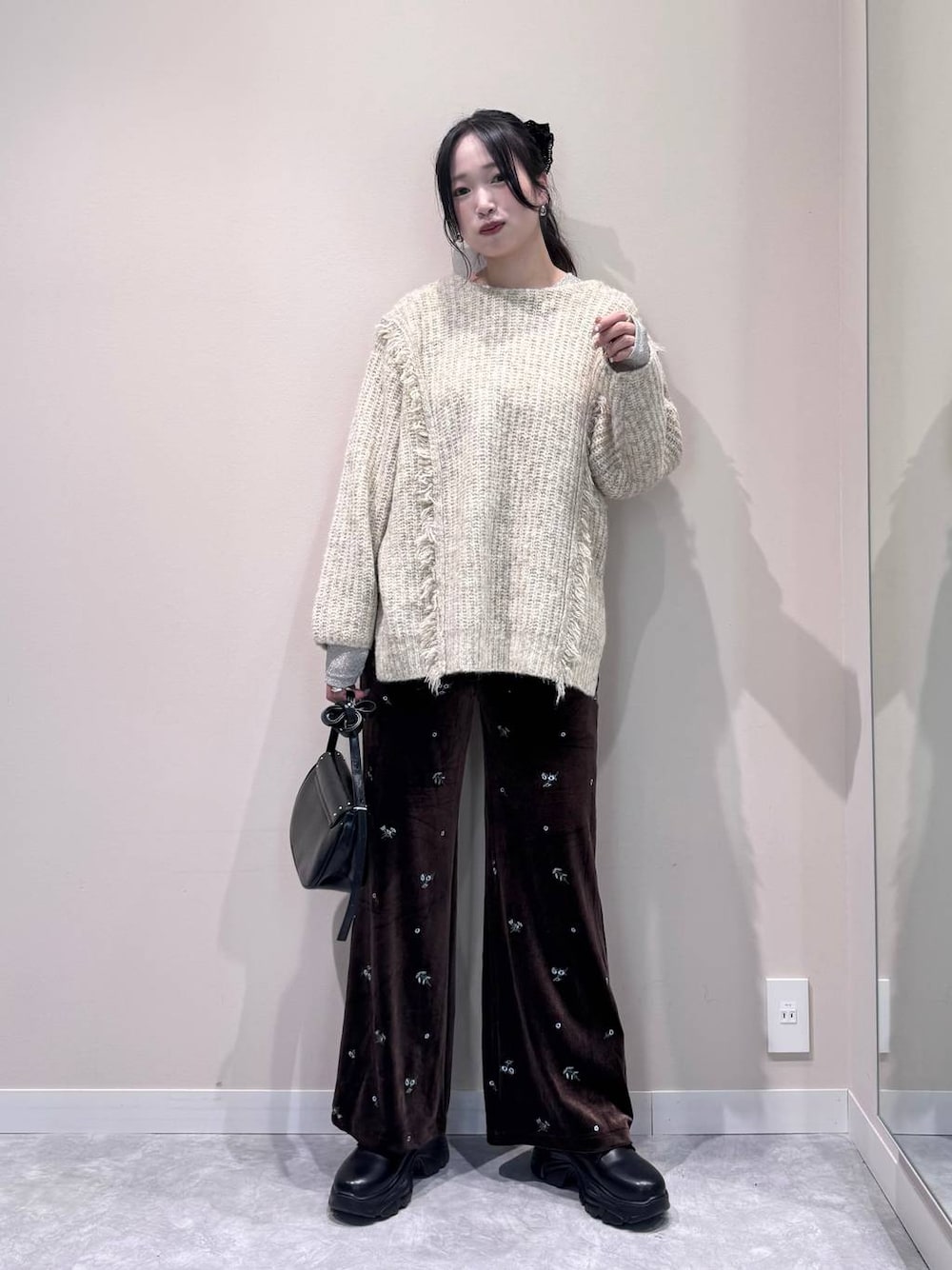 ご覧いただきありがとうございます♪ 【ニット】 メランジ素材のふんわりと軽いニットです。 Vネックとクルーネックの前後2wayで着て頂けます。 フリンジのデザインがポイントで1枚で着映えするアイテムです。 【パンツ】 トレンドの刺繍デザインのベロアパンツです。 フレアシルエットなのでオーバーサイズのトップスにもすっきりと合わせて頂けます♪