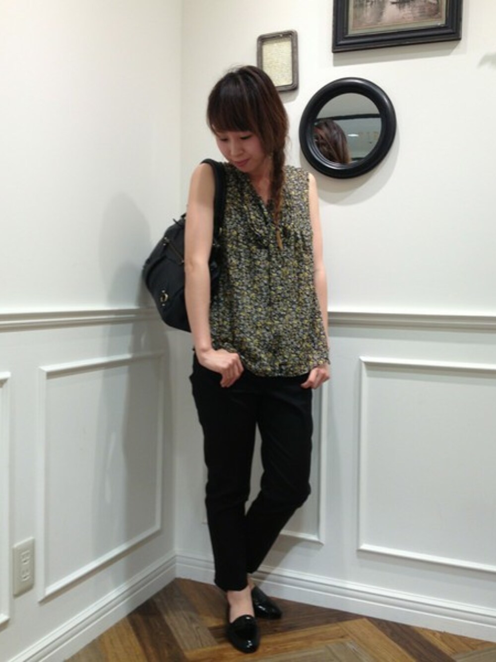 フリルのボウタイブラウスに、ブラックアイテムで甘さをおさえたスタイリング。