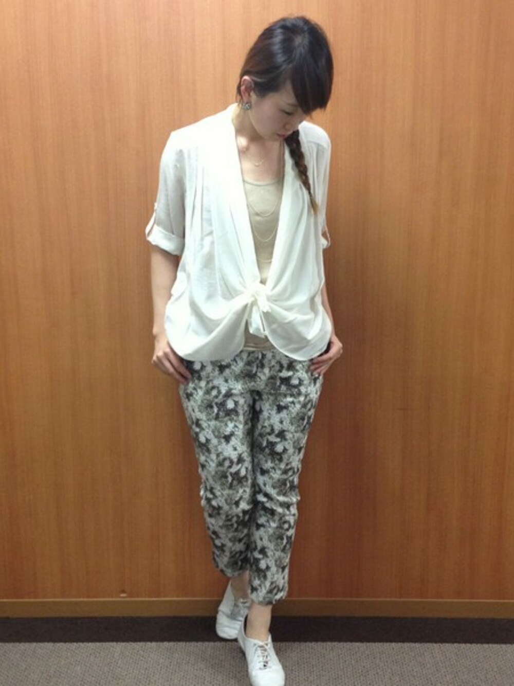 カシュクールシャツを前結びにしてスタイリング。柄パンツでトレンドアイテムもプラスしてみました。