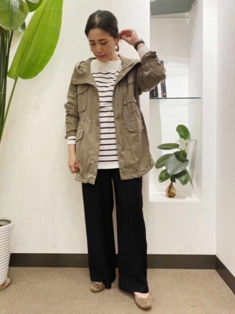 今回は休日コーデです! アウターは生地に少し光沢感があってとろみ感もありカジュアルになりすぎずに着ていただけます。 ゆったりとしていてスウェットやニットの上にも重ねやすいサイズ感です。 ウエスト絞ってスッキリとしたシルエットで着ていただけます。 パンツはゆったり、ウエストゴムでとても楽です。 きれいめに履きやすい生地感なのでトップスにボーダー合わせても全体的にカジュアルになりすぎずに着ていただけます。 ボーダーのトップスはゆったりしていて楽すぎます。 体のラインもでないですし、おしりもカバーできる長さ、最高です!