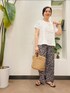 ご覧いただきありがとうございます:-) 今回は楽チンおでかけコーデです。 ブラウスは形がかわいいです。 後ろのタックのデザインが雰囲気でます。 着丈はスッキリで上下のバランス とりやすいです。 品番 DR45-23E116 パンツはウエストゴムで楽です。 柄がかわいいですし生地感は さらっとしていて履いた感じ快適です。 シンプルコーデのアクセントに◎