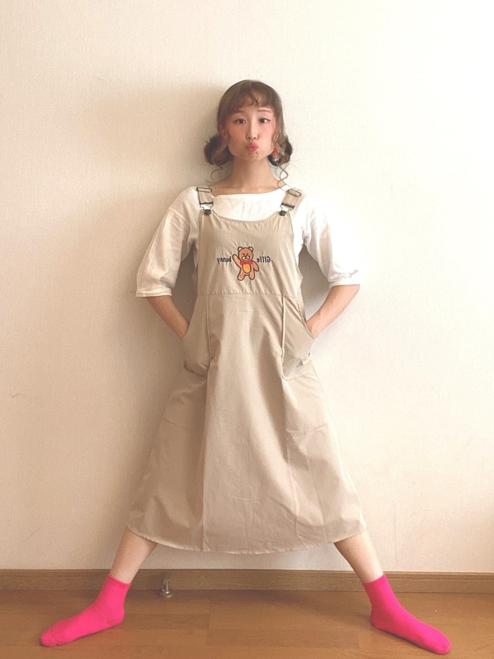 メッシュな白のトップスにエプロンワンピースを合わせました◎ ビビットカラーのピンクの靴下がお気に入りです⸜❤︎⸝