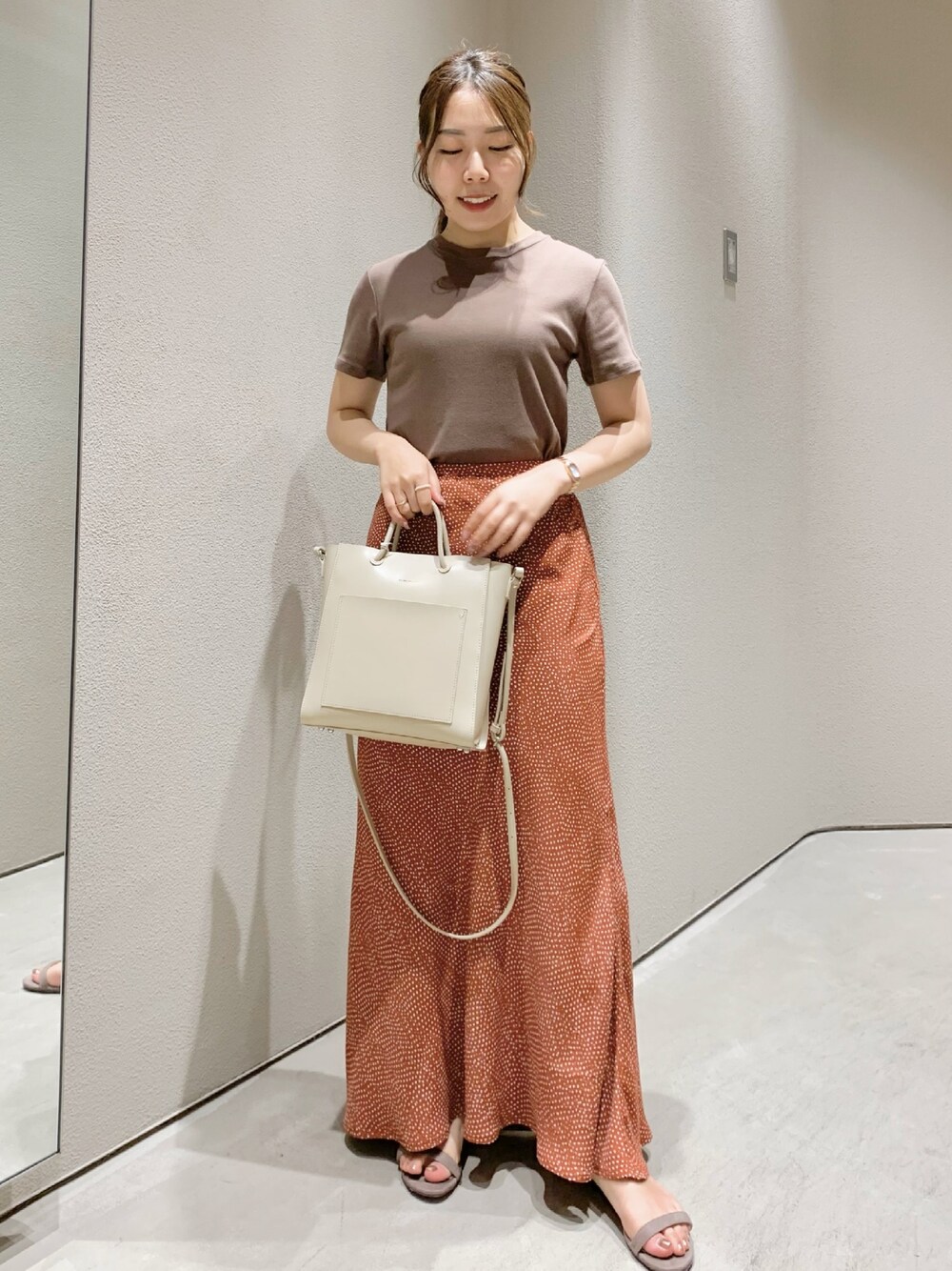 NANAHO_155cm(相互)(SHENERY梅田EST店)のスカート「レーヨンプリントマーメイドマキシスカート」を使ったコーディネート