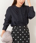 【ウォッシャブルフリルコンパクトブラウス】 サイズ感: 38サイズで着丈56cm。お尻にかかる丈感です。前後差があり、小柄な方でもバランスのとりやすい短めの着丈。 素材感: ホワイト系4:ポリエステル75%、綿20%、ポリウレタン5% ネイビー系3:ポリエステル90%、綿10% ご自宅で手洗い可能です。 着用感: エレガントな華やかさと、甘さのバランスがとれた着こなしを簡単に作れるフリルブラウス。ストレッチの効いた生地と、後ろ身頃中心のボックスタックで、動きやすさもあります。 【ウォッシャブルストレッチドットジャガードタイトスカート】 サイズ感: バックウエストはゴム仕様ではき心地が良いです。 素材感: ポリエステル77%、綿23%、(ポケット袋布)ポリエステル100% 日本製。手洗い可能。日本のジャガード産地でオリジナルで作っているこだわり素材。程よいハリとストレッチ性のある素材で着心地や動きやすさを追求。 着用感: 定番人気ドットジャガードのタイトスカート。細すぎないシルエットと丈感のバランスもポイント。シーズンレスでオンオフ幅広く着回しできます。