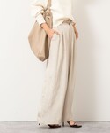【MARILYN MOON/マリリーンムーン】タックフリルストライプブラウス サイズ感: 着丈67cm。お尻が隠れる丈感です。 素材感: ポリエステル55%、レーヨン20%、ナイロン20%、ポリウレタン5% 手洗い可能。 着用感: コットン・ポリエステルのクリーンなストライプ生地を使い、特殊ミシンでつくるバイヤス・タック・フリルが構築的なパワーショルダーブラウス。ネックには繊細な取り外しリボンを施し、一点投入で華やぐ主役ブラウス。長めのカフスがシャープさをプラスしてくれます。 【ウォッシャブルクラッシュサテンワイドパンツ】 サイズ感: 後ろウエストはインゴム仕様で楽ちんにはけます。 素材感: (表地)アセテート100%、(裏地)ポリエステル100% 日本製。ご自宅で手洗い可能。『EASTMAN』社のアセテートを使用したサステナブル素材。シルクのような艶感、発色性、しなやかな風合いに加え、接触冷感・速乾性に優れてた高機能素材。 着用感: クラッシュサテンがこなれ感を演出するワイドパンツ。タックのたっぷりとしたワイドシルエットですが、すっきり見えするシルエット。シーズンレスで着用できます。