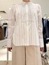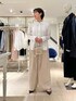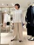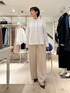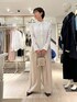 【MARILYN MOON/マリリーンムーン】タックフリルストライプブラウス サイズ感: 着丈67cm。お尻が隠れる丈感です。 素材感: ポリエステル55%、レーヨン20%、ナイロン20%、ポリウレタン5% 手洗い可能。 着用感: コットン・ポリエステルのクリーンなストライプ生地を使い、特殊ミシンでつくるバイヤス・タック・フリルが構築的なパワーショルダーブラウス。ネックには繊細な取り外しリボンを施し、一点投入で華やぐ主役ブラウス。長めのカフスがシャープさをプラスしてくれます。 【ウォッシャブルクラッシュサテンワイドパンツ】 サイズ感: 後ろウエストはインゴム仕様で楽ちんにはけます。 素材感: (表地)アセテート100%、(裏地)ポリエステル100% 日本製。ご自宅で手洗い可能。『EASTMAN』社のアセテートを使用したサステナブル素材。シルクのような艶感、発色性、しなやかな風合いに加え、接触冷感・速乾性に優れてた高機能素材。 着用感: クラッシュサテンがこなれ感を演出するワイドパンツ。タックのたっぷりとしたワイドシルエットですが、すっきり見えするシルエット。シーズンレスで着用できます。
